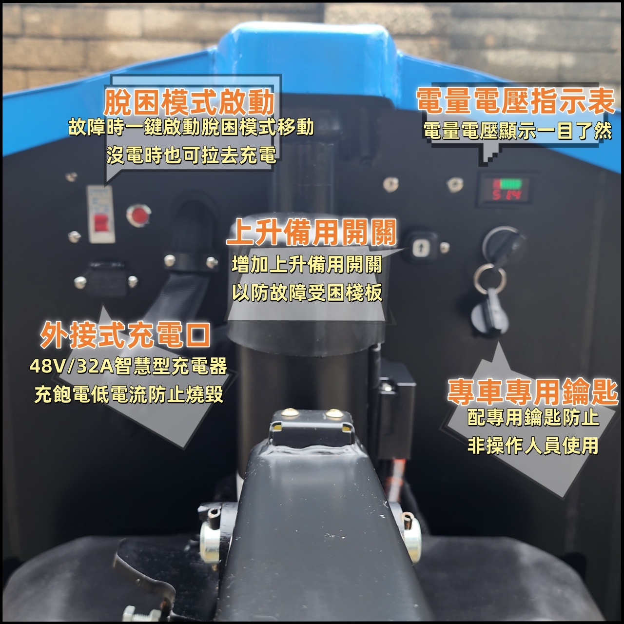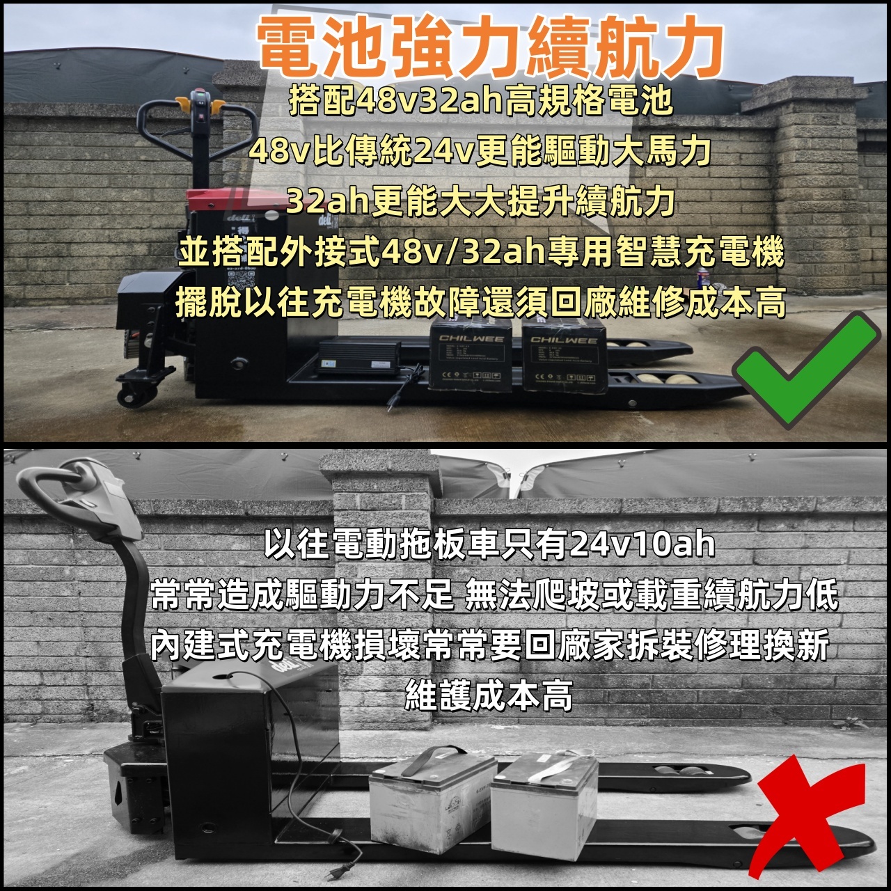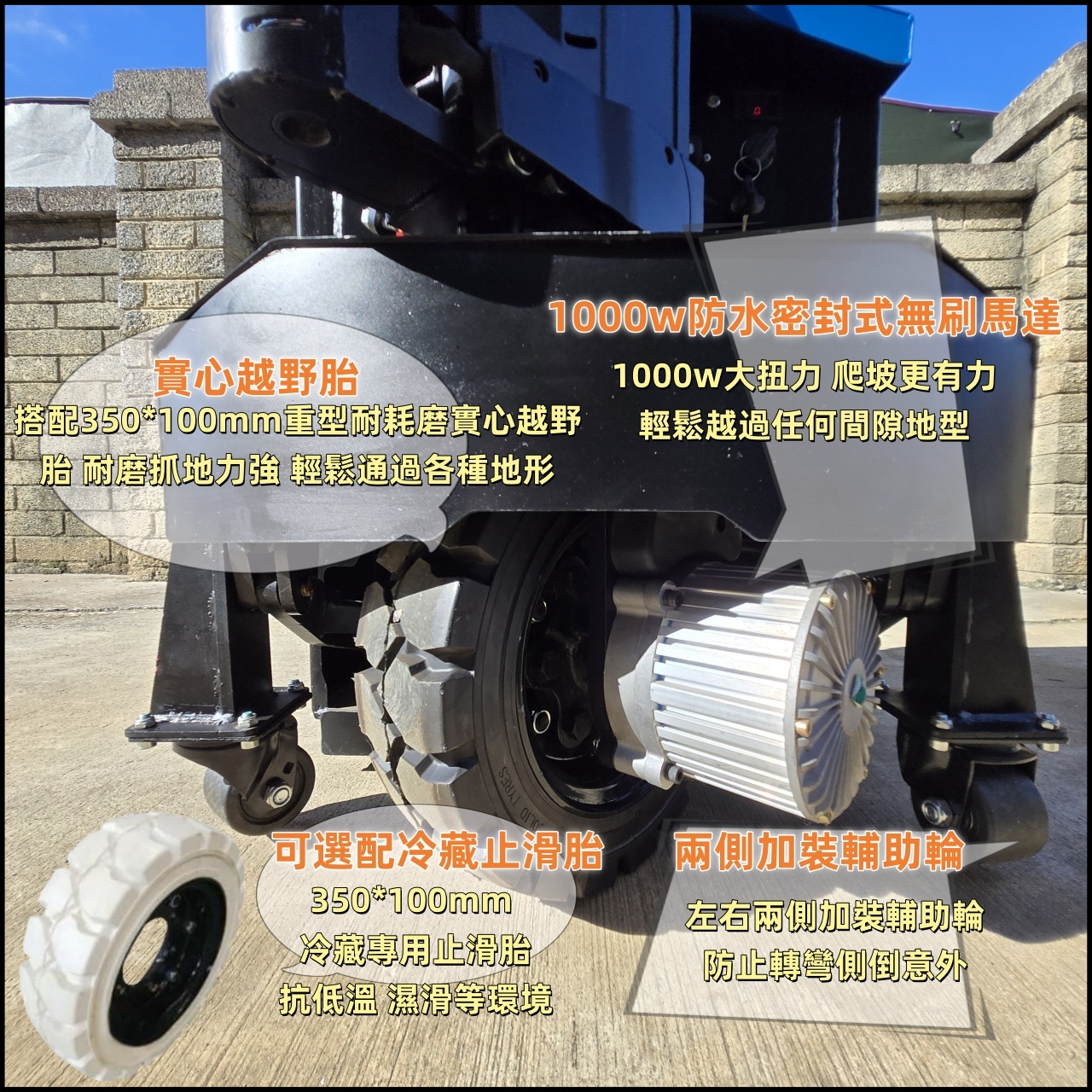 承載重量3頓 重型耐磨越野實芯輪胎全車防水 48V32AH 永磁無刷馬達.配有1000W大扭力驅動.爬坡強.載重更有力。 專利設計全密封齒輪傳動.不易浸水.又防塵.內部傳動齒輪壽命更長.穩定可靠。 驅動電機1000w 起升電機800w 滿電滿載連續使用4-4.5小時