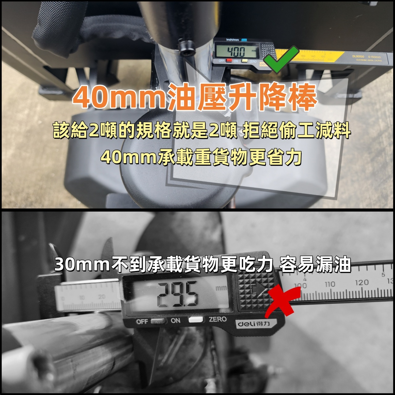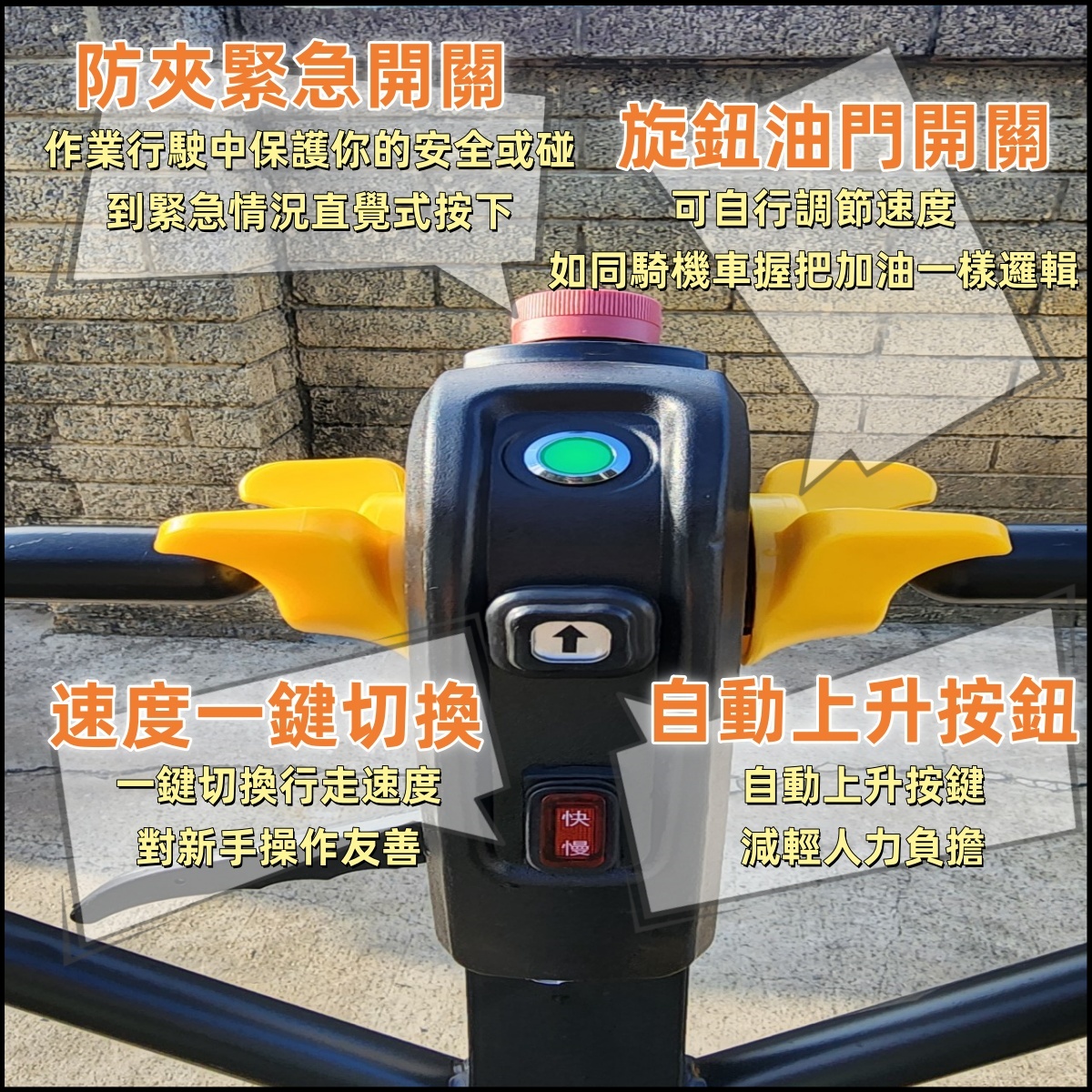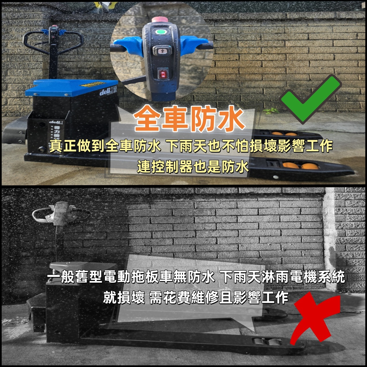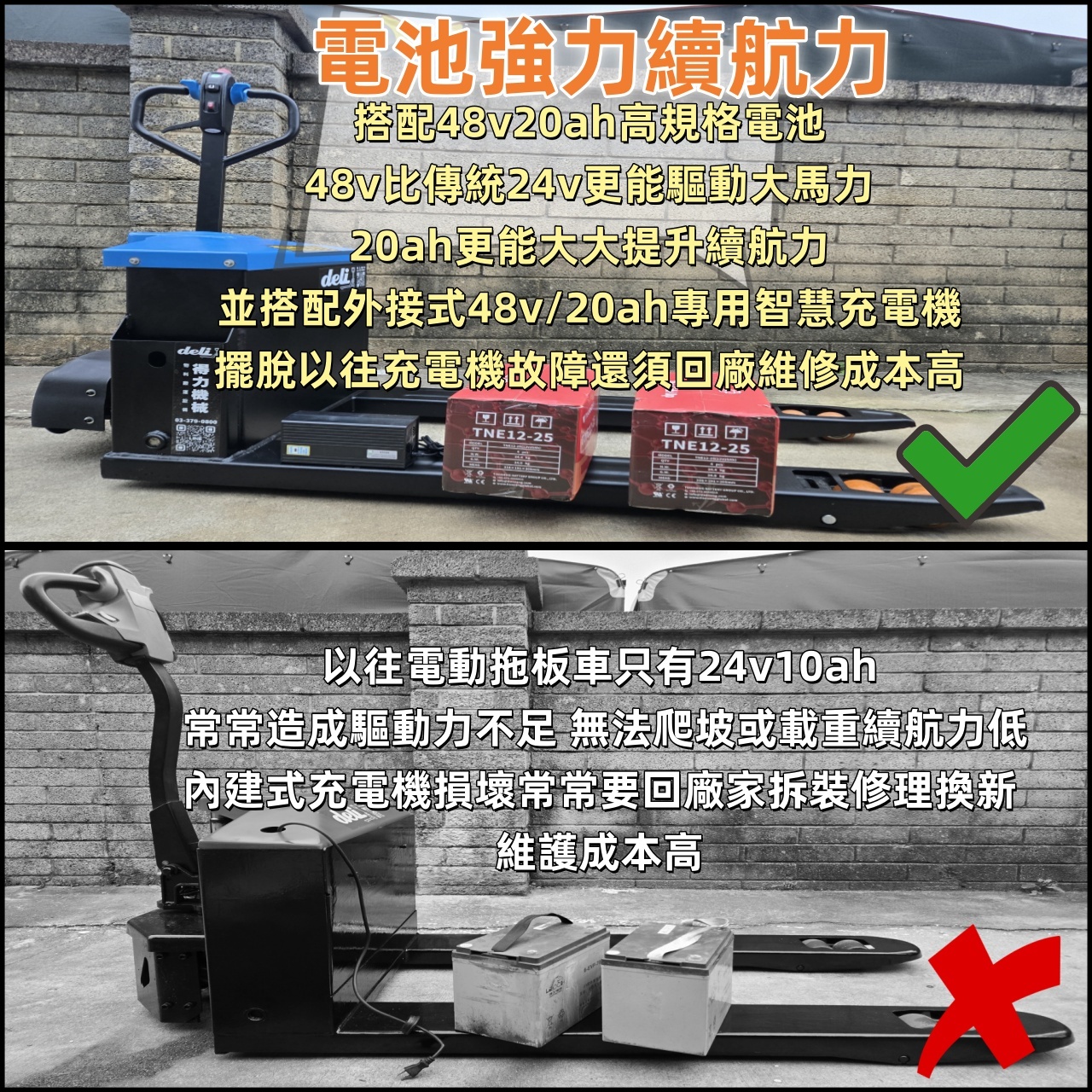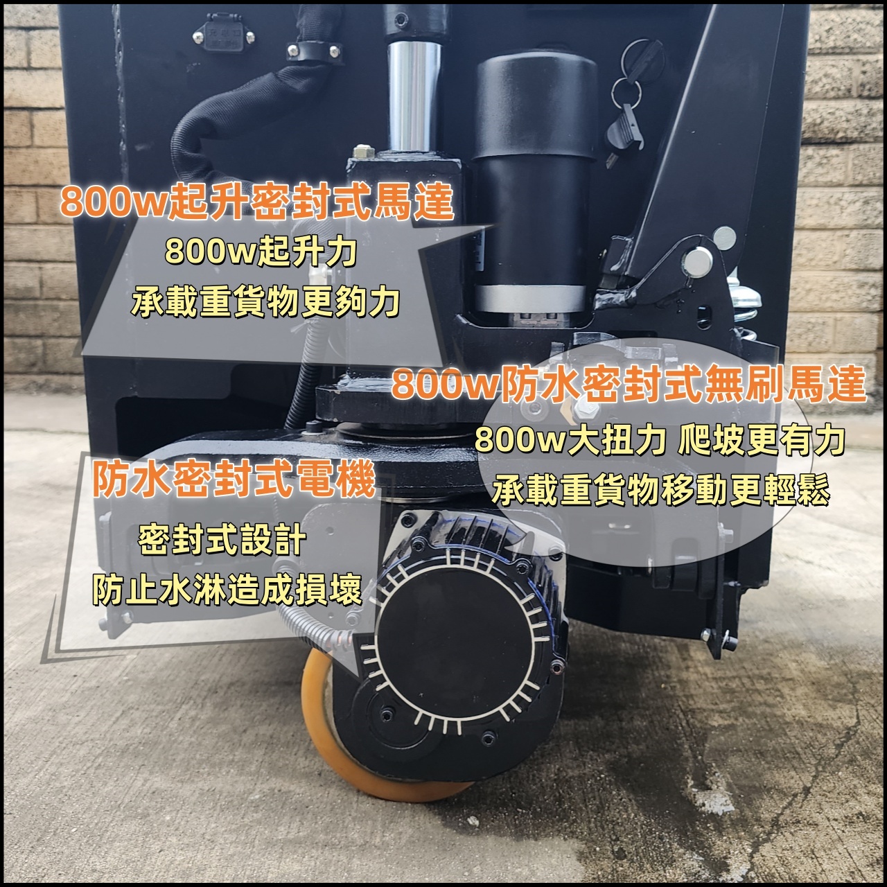 全新進化電動拖板車-海力士進化全車防水~並搭配48V20AH免保養鉛酸電池續航力大大提升~高規格電池驅動1000W永磁無刷馬達大扭力驅動~爬坡強~載重更有力。 40MM起升油壓棒搭配800W密封一體成型升降馬達~承載更給力 車體加固~牙叉四邊加強四條滿筋~移動重貨物時不易變型~該給2噸規格就是2噸規格。